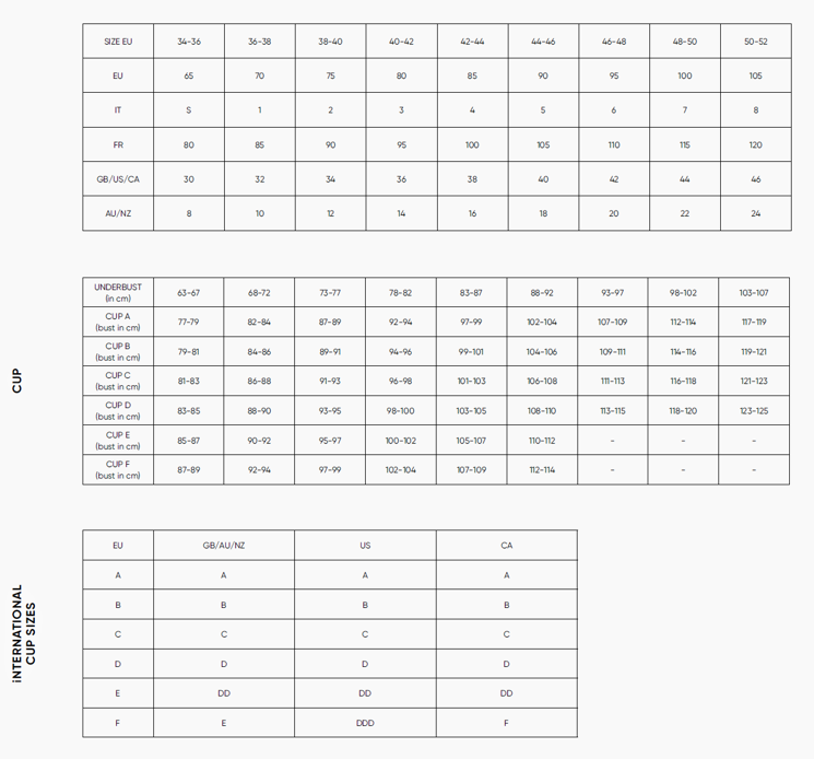 Všechny tři velikosti (32D, 34C, 36B) mají stejný objem košíčku, ale liší se pocitem a proporcemi kvůli obvodu.