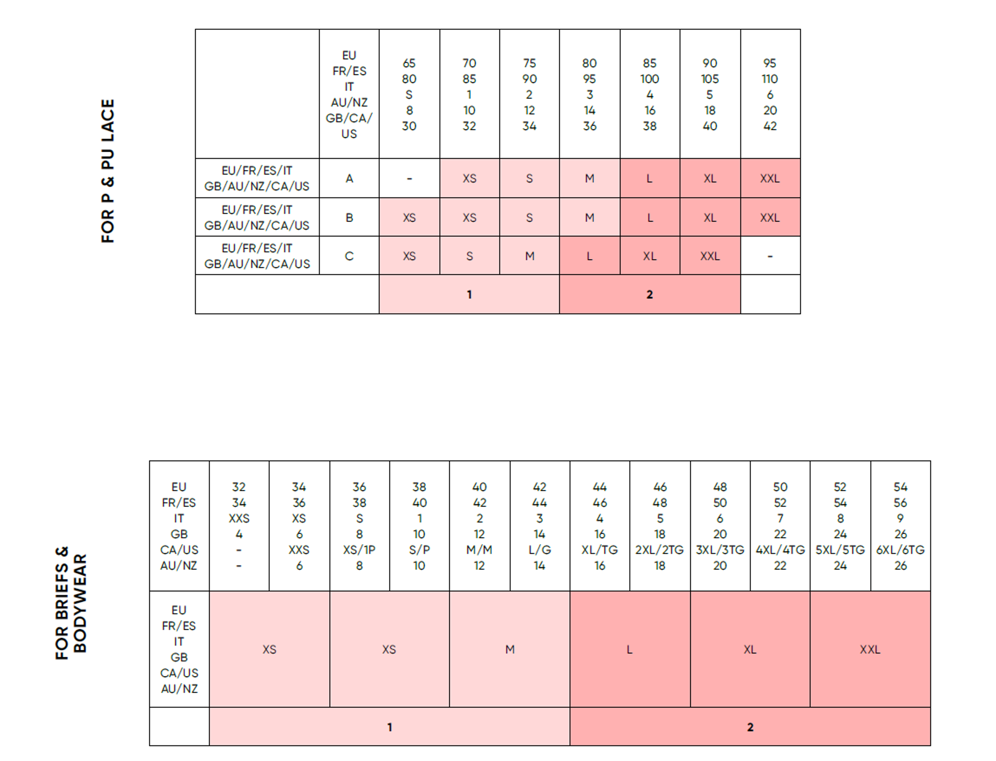 Vaše velikost podprsenky se skládá ze dvou částí: velikosti obvodu (číslo) a velikosti košíčku (písmeno). Velikost obvodu je vaše měření pod prsy, zatímco velikost košíčku se určuje podle rozdílu mezi obvodem přes prsa a pod prsy.